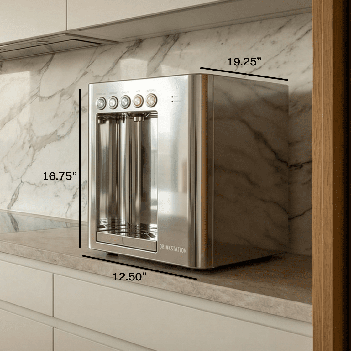 The Da Vinci 2.0 dispenser measures 12.50"W × 16.75"H × 19.25"D. Under your counter, you can add the Absolute Purifier (11"W × 16"H × 18"D) and RO Tank (10" diameter × 15.25"H).